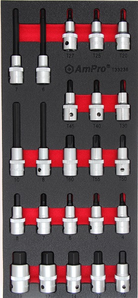 Приобрести T33236 Набор головок со вставками шестигранники и TORX 1/2", 23пр., в мягком ложементе от компании AmPro (Тайвань) из раздела Ложементы мягкие (VA серия)