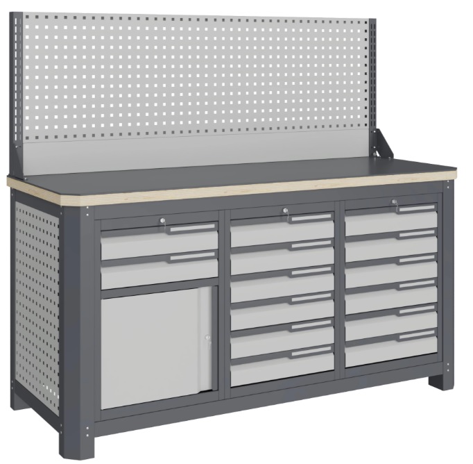 Цвет и текстура: рамы верстака, накладки столешницы, корпусов модулей RAL 7024 (серый), гладкая, глянцевая; лицевых панелей ящиков и боковых перфопанелей RAL 7047 (серый), гладкая, глянцевая; накладок ручек ящиков RAL 9006 (серый), гладкая, глянцевая.